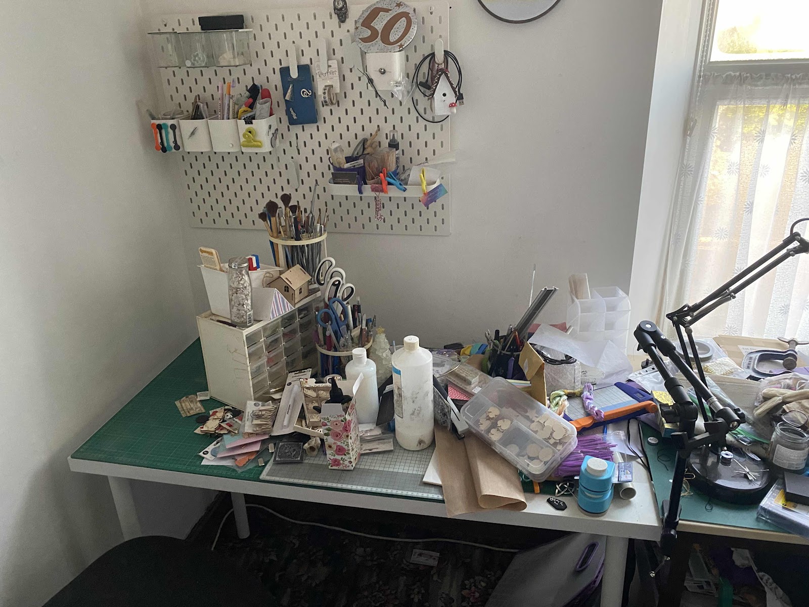 So what gives at Morti Mansions this week? Well, we've stalled a bit l while I ponder next steps. You see, I did actually sit down to start tidying the craft room up, and in doing so discovered that the entire north west corner of the house has terrible mildew. We had to pull everything out and clean the walls off, and while it dries I'm contemplating how to battle this going forwards. So the desk currently looks like this: